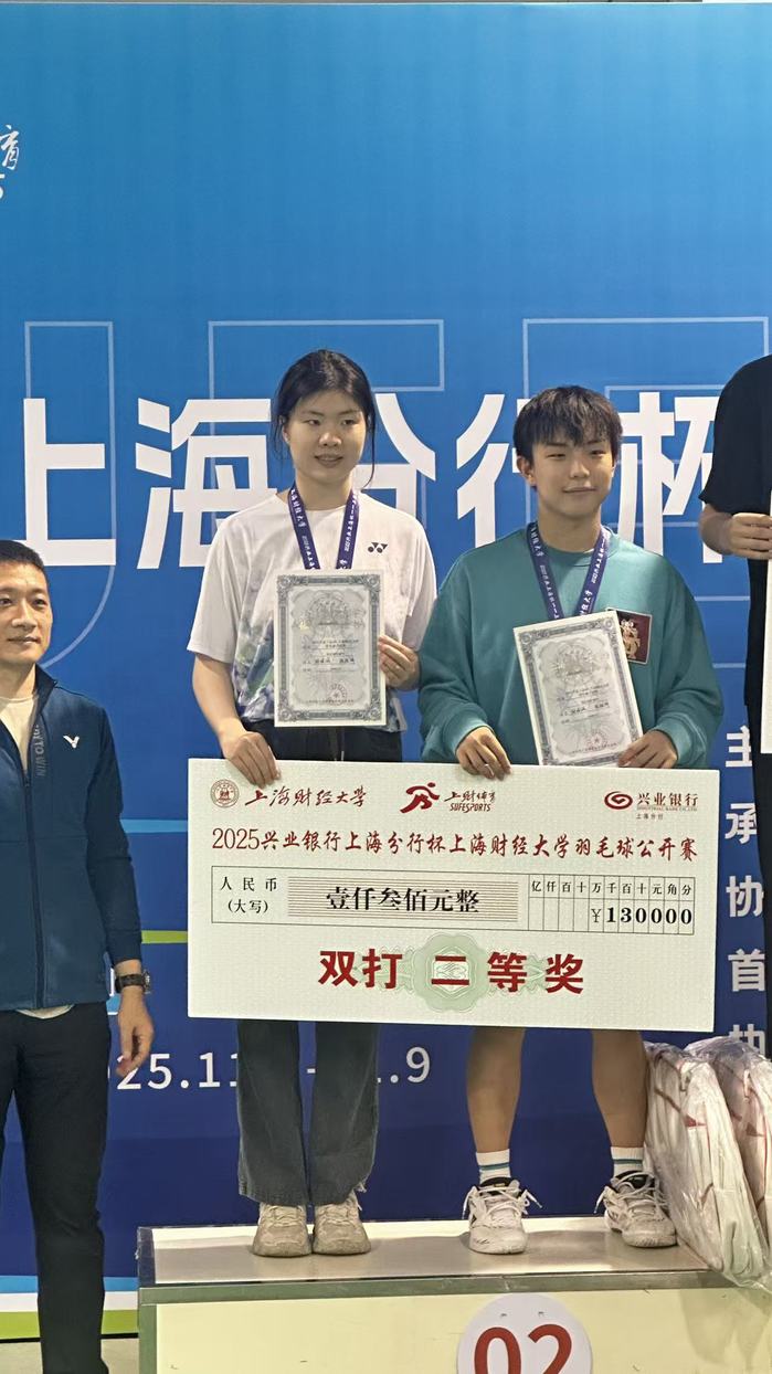 我校爱恩学院陈祖琦、经管学院胡诺诚混合双打组合在王锋老师的临场战术调整与技术指导下一路突围:先后战胜上海视觉艺术学院、上海科技大学、上海财经大学、上海立信会计金融学院等校的实力选手,成功晋级决赛;决赛中,二人与华东师范大学日本籍选手高桥太阳及搭档宋梦琪展开多轮胶着对战,最终以微弱差距惜败,斩获混双项目亚军。