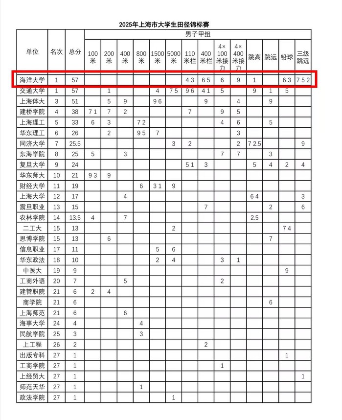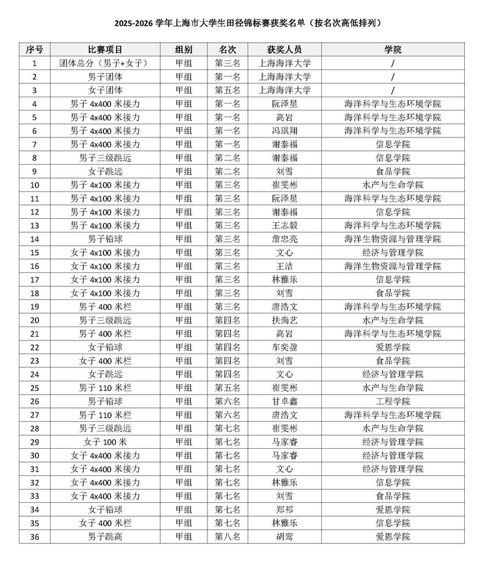2025-2026学年上海市大学生田径锦标赛于12月13日、14日在华东师范大学顺利举办,本次比赛由上海市教育委员会主办,上海市大学生体育协会、上海市中学生体育协会、上海市校园田径联盟承办,吸引了沪上43所高校近800名学生运动员参赛。海大田径队在43所高校的激烈比拼中,斩获1金2银4铜,打破3项校纪录,以男子甲组第一、女子甲组第五、甲组团体第三名的历史佳绩创下学校该项赛事历史最佳成绩,用拼搏书写青春答卷。