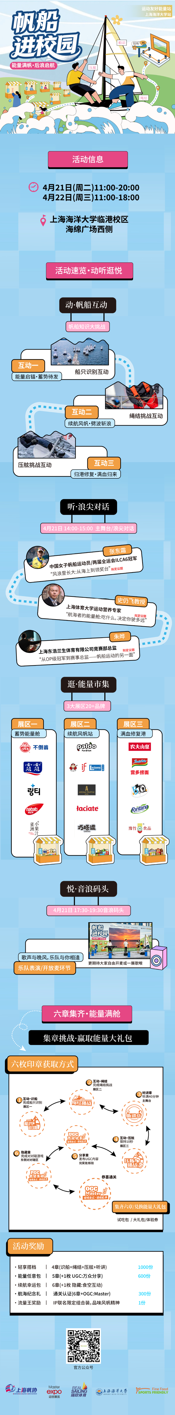 为贯彻落实《实施学生体质强健计划的意见》,促进体教融合发展,丰富校园文化生活,推广帆船运动文化,拓展我校海洋特色体育运动项目,提升学生健康素养与就业认知,体育部联合上海帆船帆板运动协会,定于4月21日起,在海绵广场举办“能量满帆·后浪启航:帆船进校园”活动。
